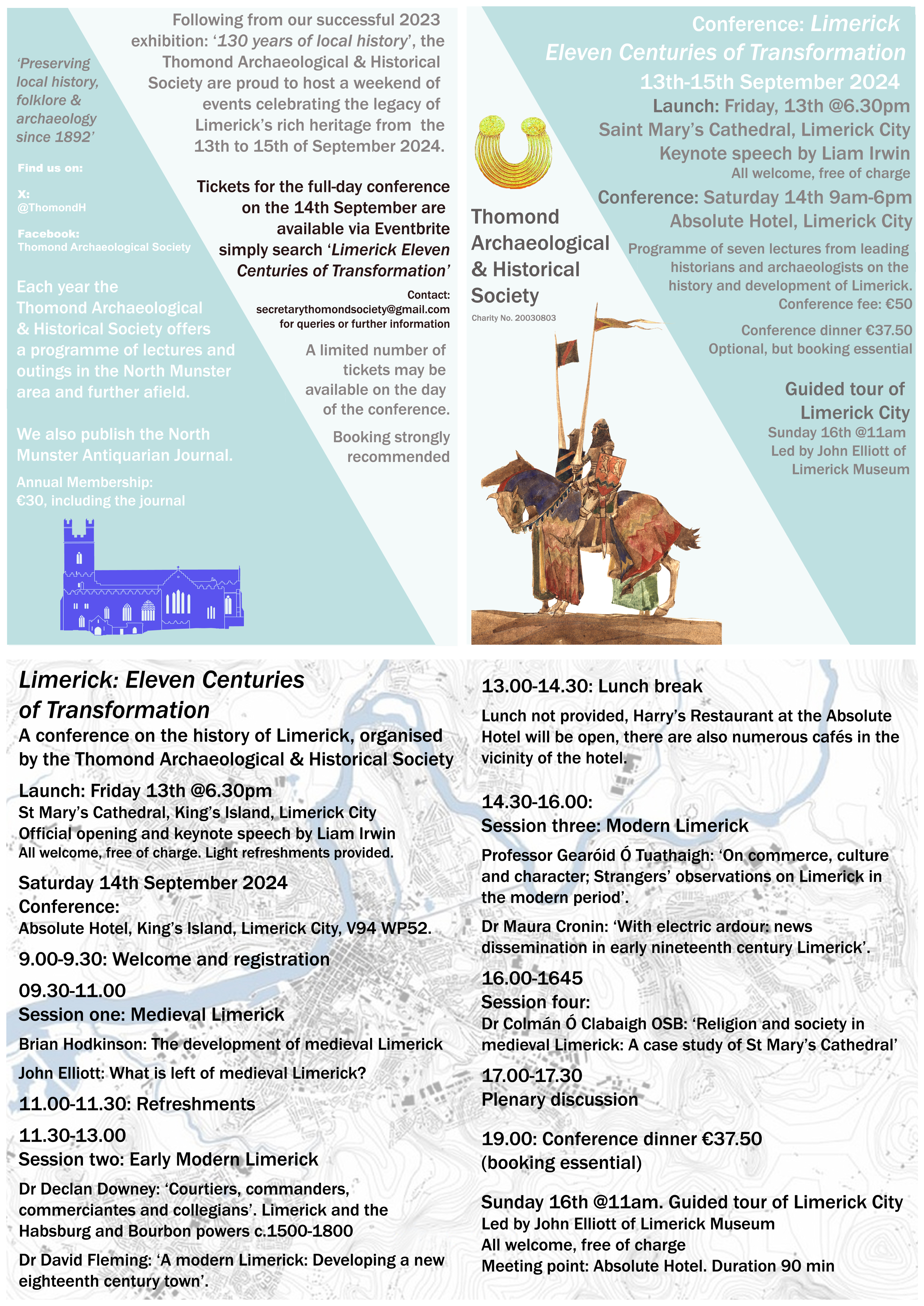 We are currently planning a TAHS conference for 13 - 15 September, the theme of which will be Eleven Centuries of Limerick's History.