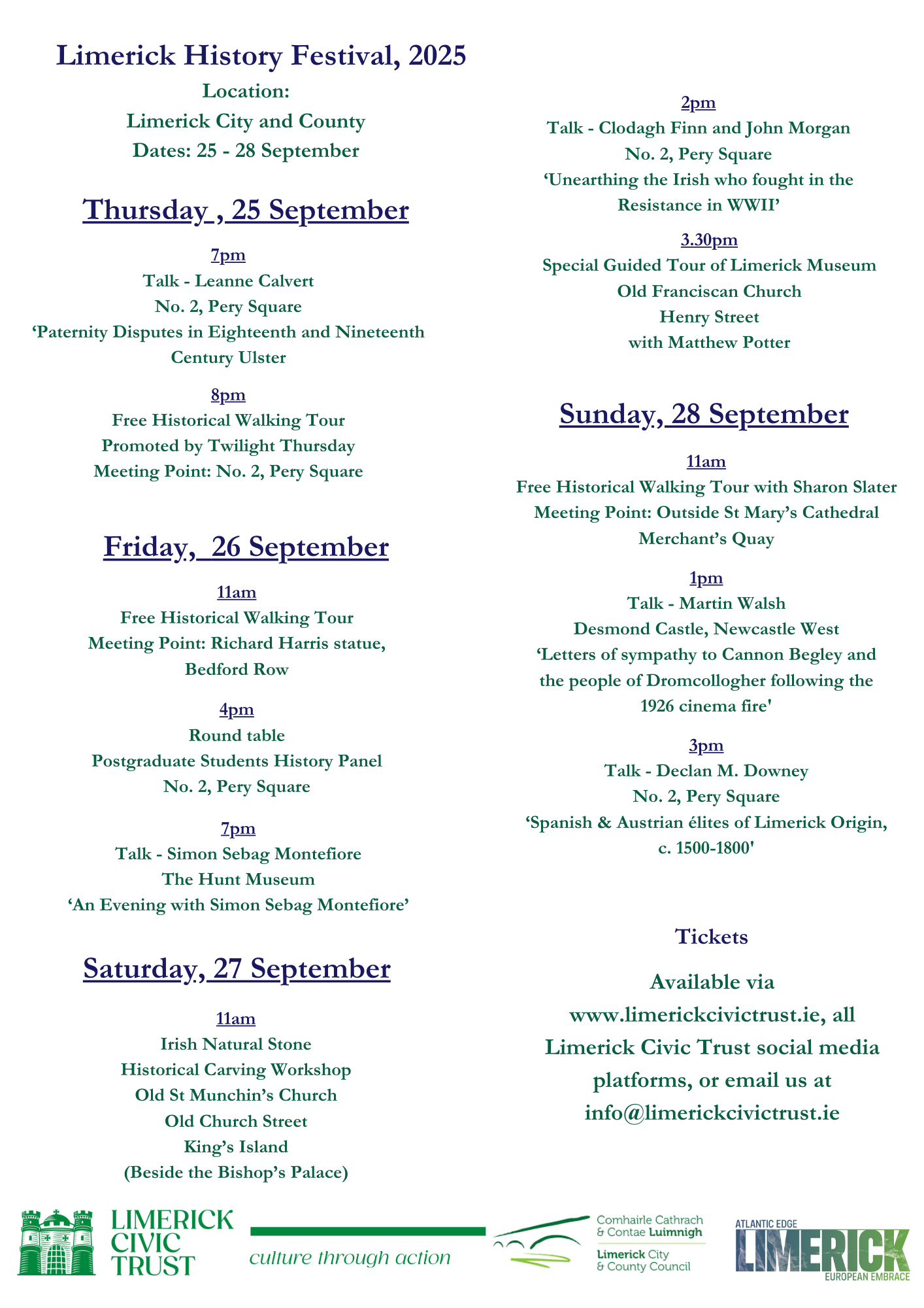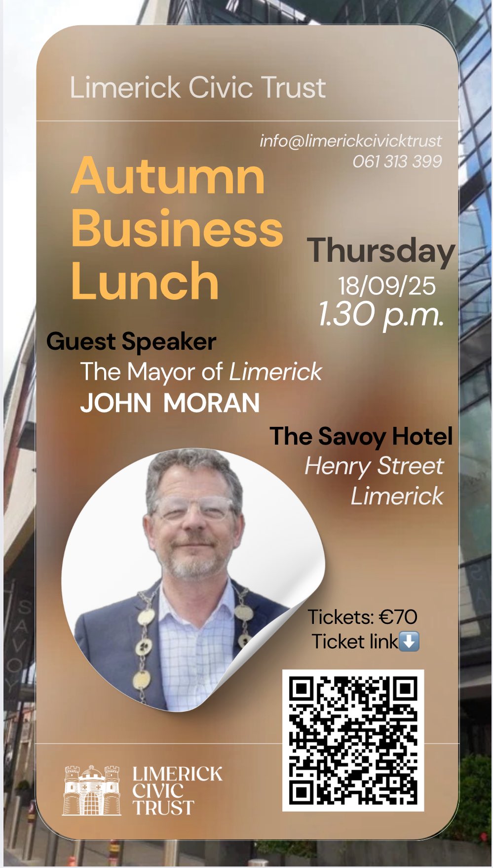 I am also forwarding a message from Limerick Civic Trust regarding their upcoming Festival of History and Autumn Business Lunch.